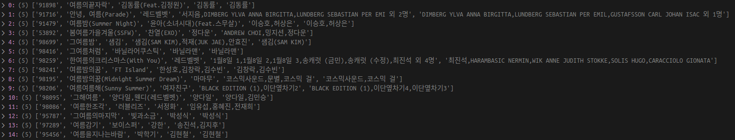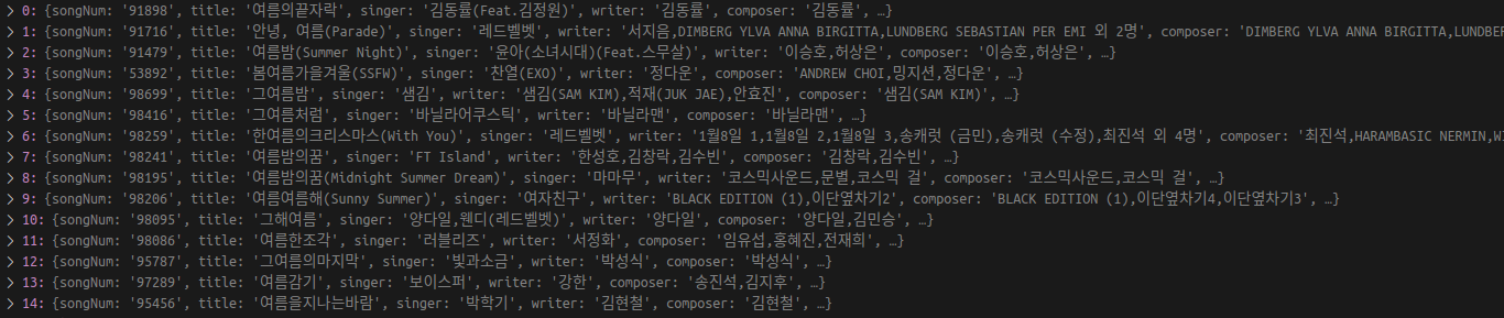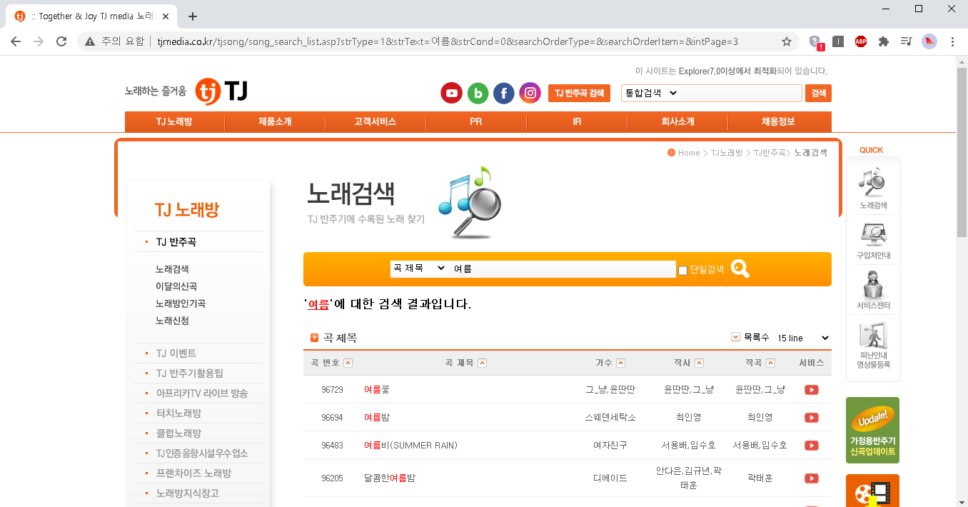노래방 업체에서 노래제목을 검색한 결과는 위와 같다. 여기서 주목할 점은 URL이다. 내가 제목으로 '여름'을 검색한 결과를 얻고싶을 때 노래방 업체에 가서 굳이 검색하지 않아도 위의 URL에 접속하면 결과를 바로볼 수 있을 것이다. 즉, 저 URL이 스크래핑의 타겟이 되는 것이다.