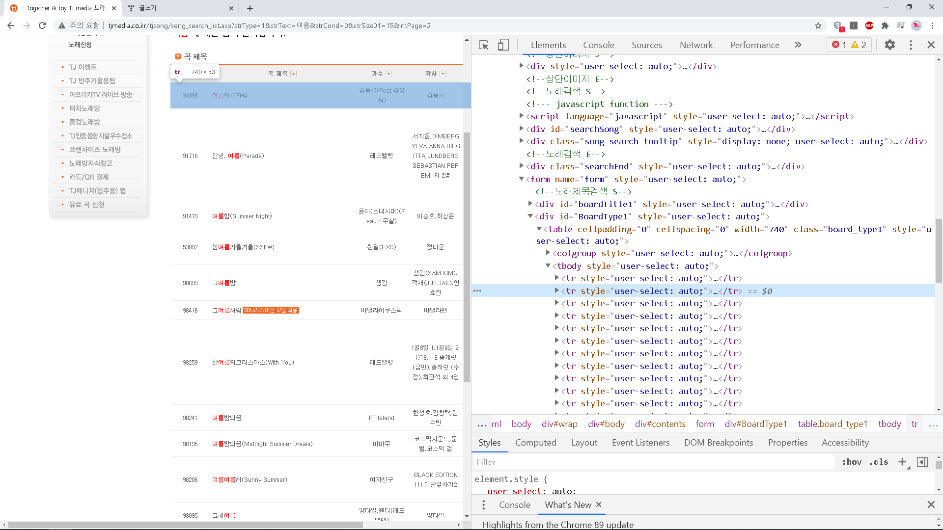 내가 원하는 부분의 데이터를 찾기 위해 먼저 크롬의 개발자 도구를 활용해보자. 크롬 개발자 도구를 이용하면 페이지의 어떤 부분이 어떤 HTML 요소인지 쉽게 찾을 수 있다. 내가 원하는 노래 검색 결과는 데이터 위 캡쳐에서 파란 색으로 표시된 부분부터이다. 이때 가장 위의 tr은 테이블의 헤더에 해당하는 부분이므로 제외시킨다.