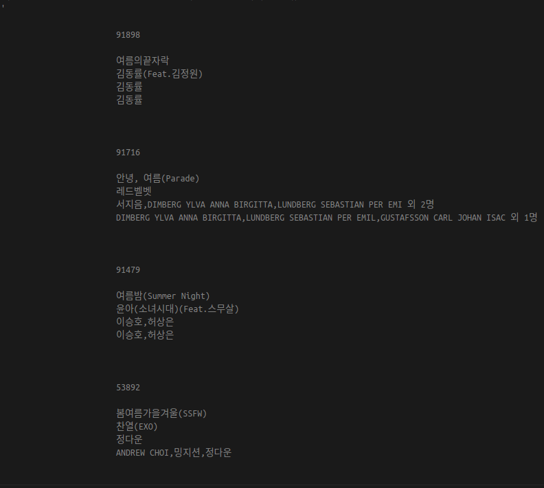 탭을 제거하니 위와 같은 결과가 발생한다. 줄바꿈을 제거하지 않는 이유는 줄바꿈은 각 노래와 속성들을 구분할 수 있는 기준으로 삼을 수 있기 때문이다.