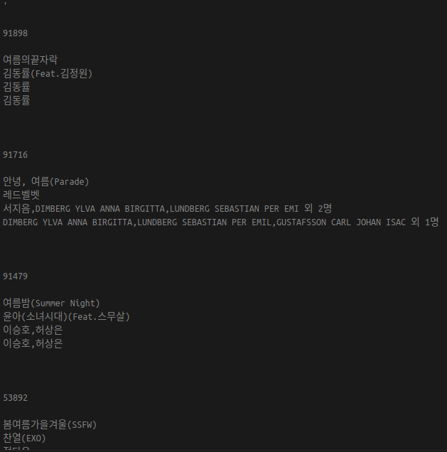 먼저 각 노래를 분리시켜보자. 결과 텍스트를 분석해보면 곡번호 앞에 한 번의 줄바꿈, 작곡가 뒤에 두 번의 줄바꿈이 항상 존재하는 것을 알 수 있다. 즉, 하나의 노래는 9줄의 텍스트로 이루어져 있는 것이다.