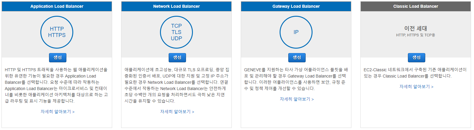 | 기능 | Application Load Balancer | Network Load Balancer | Gateway Loac Balancer | Classic Load Balancer |