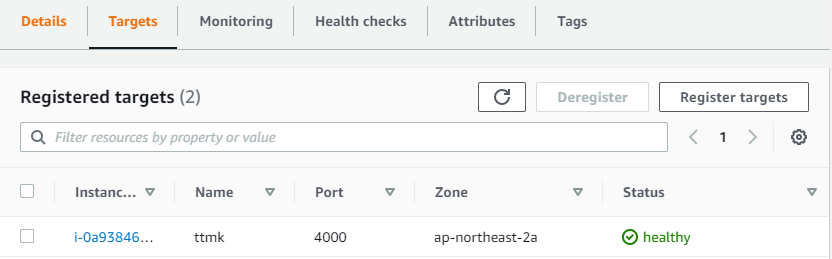 위 이미지는 등록한 결과라 타겟이 있지만, 처음 이 항목에 들어왔을 때 진짜 Registered targets이 하나도 없었다! 그래서 위의 Register targets라는 버튼을 통해 나의 EC2 인스턴스를 연결해주었더니 해결되었다!