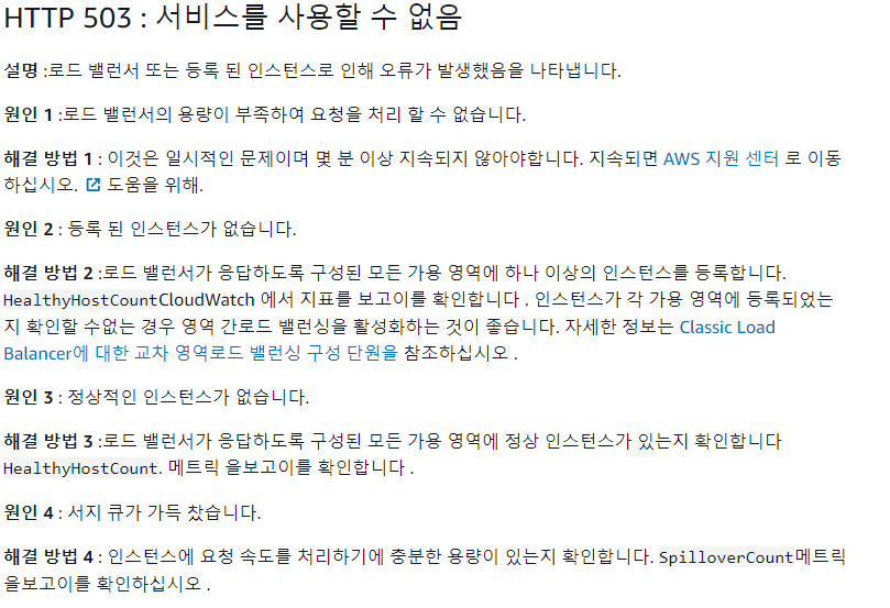 +추가적으로 찾아보니 내가 찾은 AWS 가이드문서는 CLB의 트러블슈팅이었다. ALB의 경우 로드밸런서의 타겟이 없는 한 가지 경우만 503에러가 발생하는 것으로 보인다.(하단 링크 참고)
