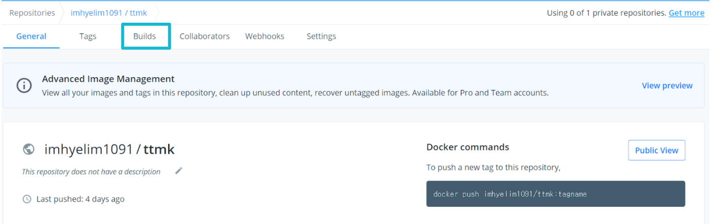 빌드 기록도 DockerHub 내에서 볼 수 있다.