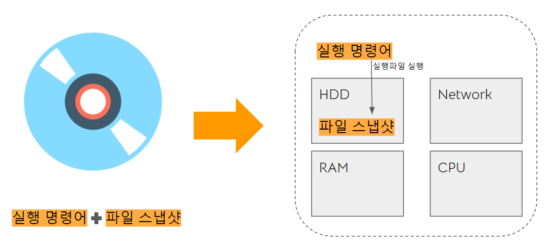 이미지는 컨테이너 시작시 실행될 명령어와 프로그램 스냅샷(프로그램을 실행하는데 필요한 파일 + 실행파일)로 구성되어있다. 이를 컨테이너화하면 컨테이너는 실행 명령어를 통해 실행파일을 실행시킨다. 이 때 컨테이너는 프로세스를 실행시킬 최소한의 리소스를 함께 포함하고 있다.