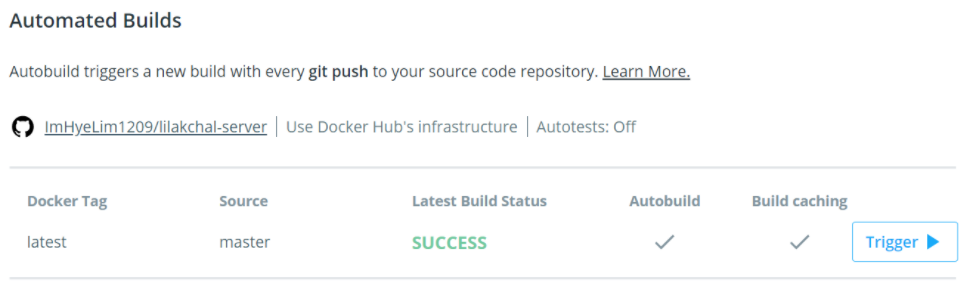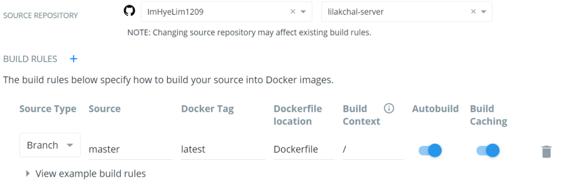 그 후에는 연결할 GitHUb 저장소와 빌드 옵션을 지정한다. 위 내용은 나의 lilakchal-server라는 GitHub 저장소의 master브랜치가 변경되면 Dockerfile을 이용하여 latest라는 태그로 빌드할 것이라는 의미이다.