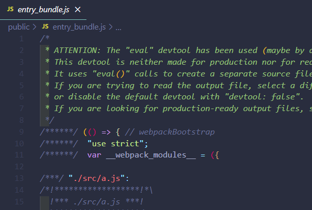 웹팩은 development/production 2개의 모드가 존재하며, 모드에 따라 결과물이 다르다. 모드를 지정하지 않으면 production모드로 번들링이 진행된다. 위 캡처은 development 모드로 실행한 결과이다. development 모드의 결과물은 웹팩 로그를 포함하며 코드를 압축하지 않는다.