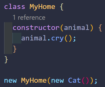 가장 간단한 방법은 Cat클래스를 가져와서 지정하는 방법이다. 현재 코드에서 MyHome 인스턴스를 생성할 때 Cat 클래스를 사용하기 때문이다. 코드를 다시 살펴보자. 의존성이 제거되었는가? 여전히 MyHome를 구현하기 위해 Cat 모듈을 import하고 있으므로 의존성이 제거되었다고 볼 수 없다. 또한 Cat 외의 다른 동물로 변경하기 위해선 MyHome 생성자 함수의 코드를 변경해야하는 점도 여전하다.