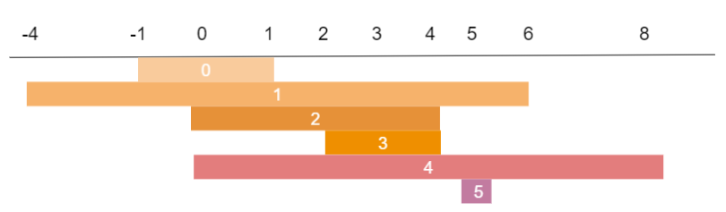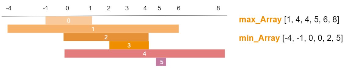 max 값과 min 값을 정렬하면 위와 같다. 이 상태에서 겹치는 쌍을 찾아보자. x축을 왼쪽부터 보는게 편하므로 min_Array순으로 원들을 순서대로 놓아가면서 비교할 것이다.
