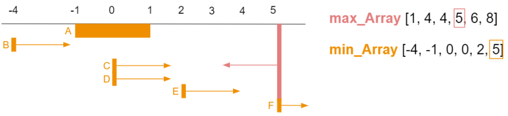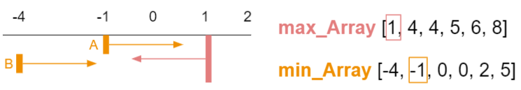 새로운 원(-1)이 추가되었을 때 먼저 max_Array를 이용하여 범위를 초과하는 원이 있는지 확인한다. 즉, min인 -1과 max인 1을 비교하는 것이다. min < max 이므로, 모든 원이 -1보다 더 큰 지점에서 끝난다는 것을 알 수 있다. 즉, 지금까지 놓여진 원 A(-4)와 원 B(-1)은 언제 끝나는지 정확히 알 수 없지만, 적어도 1 이상의 지점에서 끝나므로(max) 두 원은 겹치는 원이 맞다.