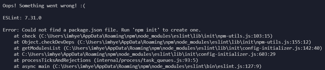 eslint --init을 하다가 Could not find a package.json file 이라는 오류와 만났다. 이는 말 그대로 eslint --init을 하기 전에 package.json 파일이 필요하기 때문에 npm init으로 package.json파일을 만들어주면 된다.