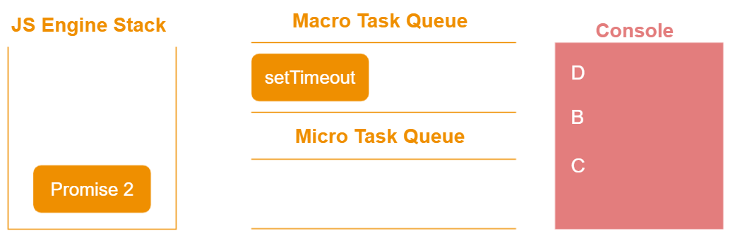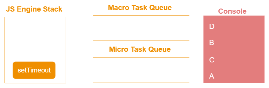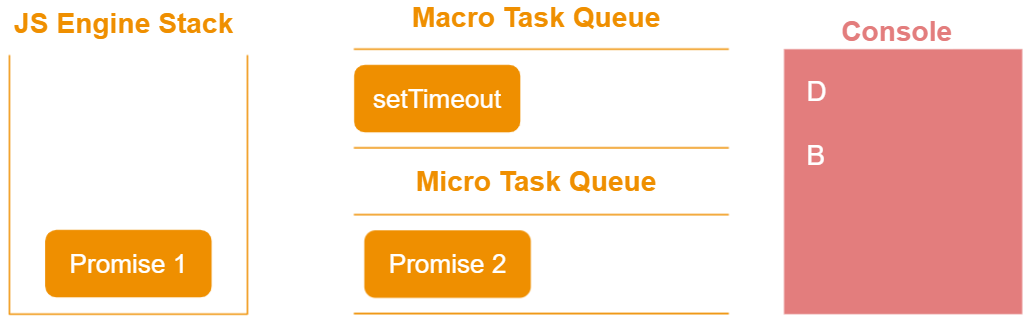 우선 Macro Task Queue에 있는 가장 오래된 작업 하나를 실행한다. 따라서 Console에 D가 찍힌다.