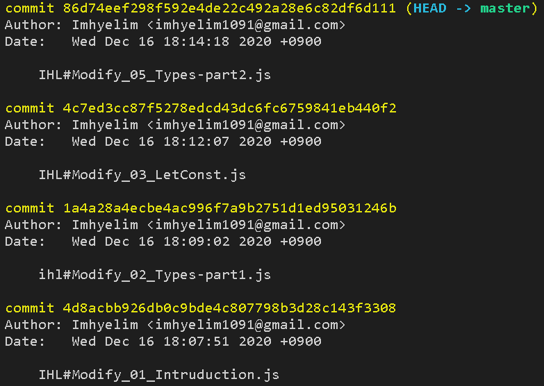 git commit -m '커밋메시지내용..' 명령어로 commit 할 수 있으며 commit 내역은 git log 명령어로 확인할 수 있다.
