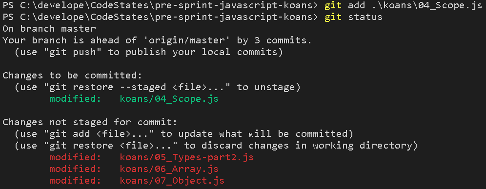 git add 주소 명령어로 Stage Area에 코드를 add할 수 있으며 명령 수행 후 git status를 해보면 Staging Area에 add한 파일이 올라와있는 것을 알 수 있다.