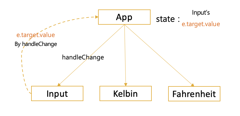 상태를 공유하는 일반적인 방법은 상태 끌어올리기이다. App에서 handleChange라는 함수 prop을 Input에게 내려주고, Input은 사용자 입력이 발생하면 handleChange를 사용자 입력과 함께 호출을 하여 App에 사용자 입력을 전달하는 것이다. App에 도달한 사용자 입력 상태는 켈빈과 화씨 컴포넌트로 전달된다. 코드는 다음과 같다.