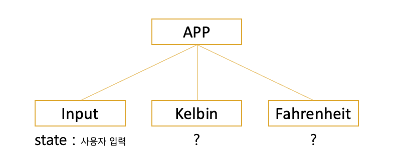나는 이 프로그램의 컴포넌트 구조를 위와 같이 짜기로 했다. 최상위에 App이 있고, Input, 켈빈, 화씨 컴포넌트가 하위에 존재하는 구조이다. Input은 사용자의 입력을 받아 이를 상태로 관리하는 컴포넌트이다. 이때 켈빈과 화씨 컴포넌트가 본인의 변환 결과를 렌더링 하기 위해선 사용자 입력이 필요하다. 켈빈과 화씨는 어떻게 사용자 입력을 가져올 수 있을까?