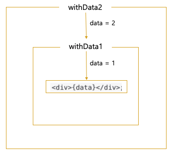 이름 중첩 해결을 구체적으로 보면 위와 같다. withData2에서 전달된 2라는 데이터는 render 함수의 data2라는 parameter에 해당되므로, 내부 HOC(withData1)에는 data2라는 새로운 이름으로 전달되는 것이다.