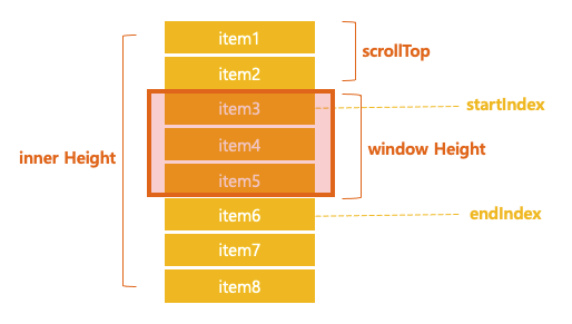 가상화 목록의 구조는 위 그림과 같다. 위 그림에는 3가지 요소가 있는데, Inner Height, Window Height, SrollTop이다. 스크롤의 위치가 바뀔 때마다 3가지 요소 및 파생 값을 재계산하여 화면에 보여야 할 항목들을 추출하여 리스트를 재 렌더링 한다. 코드로 함께 살펴보자.