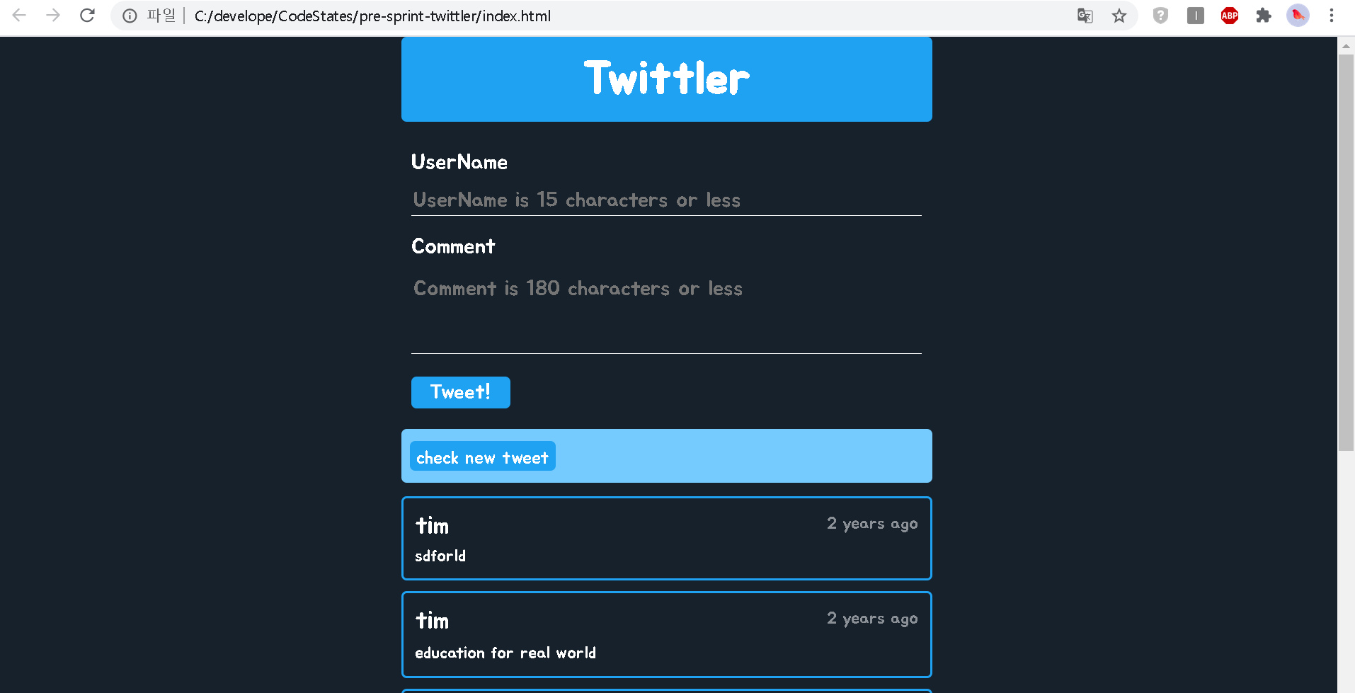 - 버튼의 텍스트가 'check new tweet'라면 새로운 트윗을 생성 후 이를 트윗배열(DATA)에 넣는다.