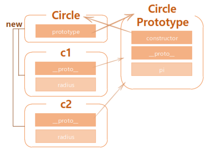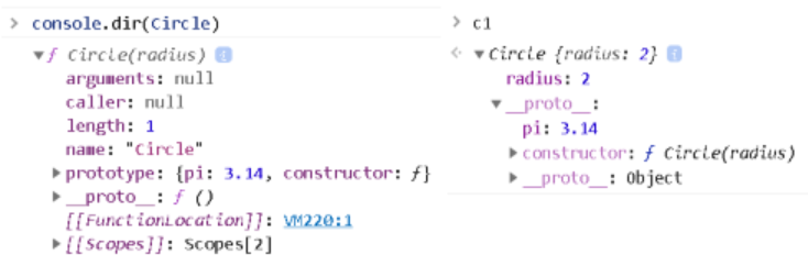 new 키워드를 통해 만들어진 Circle 객체인 c1, c2는 Circle의 prototype 속성을 cloning하여 만들어지며 Circle의 prototype 속성과 __proto__라는 링크로 연결되어있다. 즉, 함수의 prototype 속성은 하위 객체들에게 상속시킬 연결에 대한 속성이며, 객체의 __proto__는 상위에서 상속받은 prototype에 대한 정보인 것이다.
