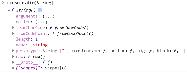 string의 원형객체는 String 함수의 prototype 속성이며 concat() 등의 함수가 포함되어있다. 이는 window객체가 선언하지 않았지만 전역으로 존재하는 것처럼 String, Number, Array 등의 함수가 이미 전역으로 선언되어있으며, string 타입 변수는 String.prototype을 상속받고있는 것이다. 다음처럼 미리 선언된 String 함수를 확인할 수 있다.