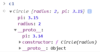 c1의 구조를 살펴보면 c1 자체에는 pi 속성이 없는 것을 알 수 있다. 대신 c1의 객체원형에 pi가 존재한다. 즉, c1.pi를 수행하면 c1에 pi가 있는지 찾아보고 없으면 __proto__를 타고 c1의 원형 객체에 가서 pi가 있는지 탐색하여 결과를 돌려주는 것이다.
