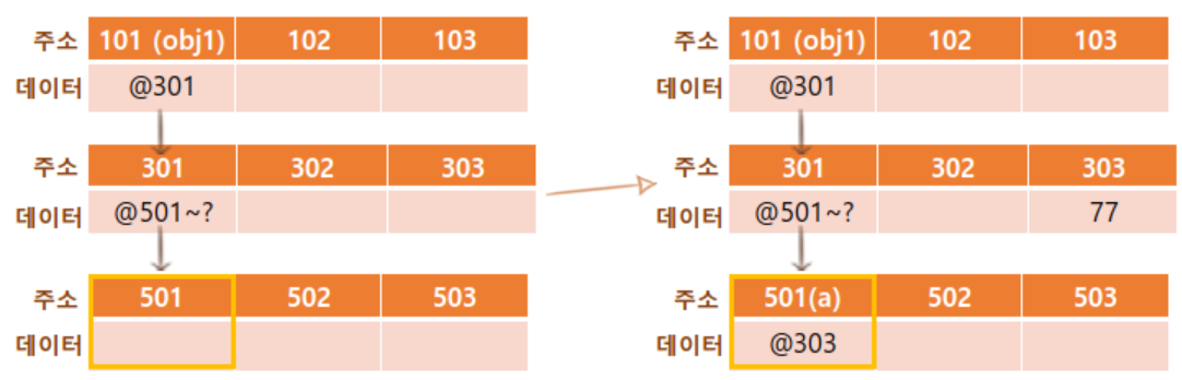 위 코드에서 obj1에 새로운 객체를 생성하여 할당하였기 때문에 obj1식별자의 값은 @301에서 @302로 변경된다(갈색박스). 이 때 const로 선언된 변수는 저장하고 있는 값(주소)의 변경이 불가능하므로 오류가 발생하는 것이다.