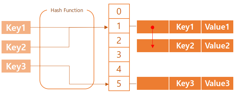 해시 함수는 키를 해시로 변환하는 함수이다. 여러가지 값을 갖고 있는 키를 일정한 형식을 갖도록 변환함으로써 저장소를 관리한다. 예를 들어 해시 테이블의 저장소가 2칸(bucket) 이라면 hash function이 fn(){ return %2 }라 정의하고 Key가 홀수인 경우 저장소의 1번 칸에, 짝수인 경우는 0번 칸에 저장하도록 구조를 만들 수 있을 것이다. 이 때 Key가 11, 20, 21이 들어왔다면 11과 21은 해시 함수 에 의해 1이라는 같은 값을 갖게 된다. 이 경우 두 값은 어떻게 저장될까?