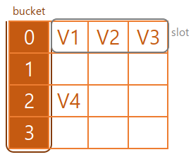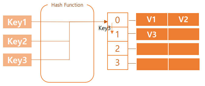 버킷은 테이블의 크기이자 키를 입력받는 해시 함수의 결과 범위이다. 위 그림에서 bucket은 갈색으로 칠해진 부분을 의미하며 그림의 bucket의 크기는 4이고 범위는 0~3이다.