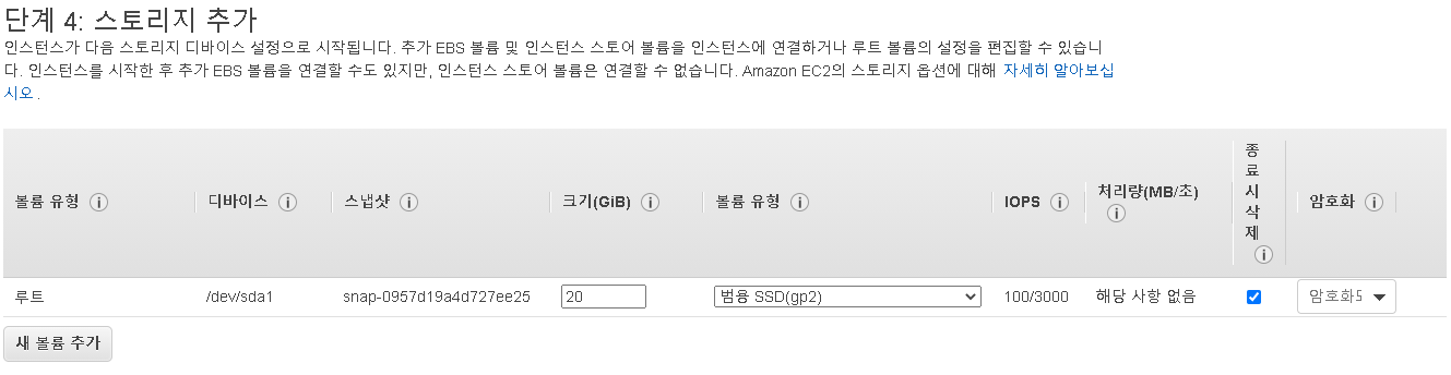 프리티어 계정은 30GB까지 스토리지를 사용할 수 있다. 30GB 범위 내에서 스토리지를 추가해주자.