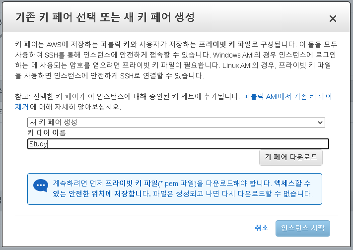 시작하기를 누르면 키 생성 페이지에 접속된다. 새로운 키 생성을 선택하고 적당한 이름을 지은 후 다운로드 받자.