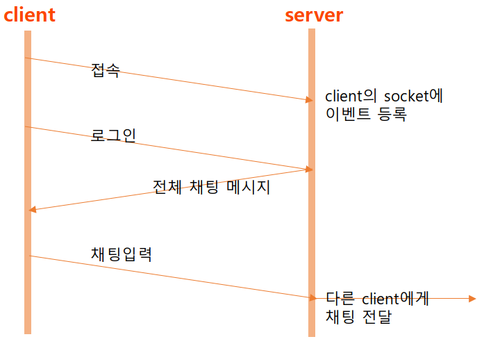 간단히 표현한 흐름은 위와 같다. client가 접속하여 로그인 하면 전체 채팅 메시지를 보내주고, 채팅을 입력하면 다른 클라이언트에게 채팅을 전달함으로써 실시간으로 채팅할 수 있는 것이다. 주요코드는 다음과 같다.