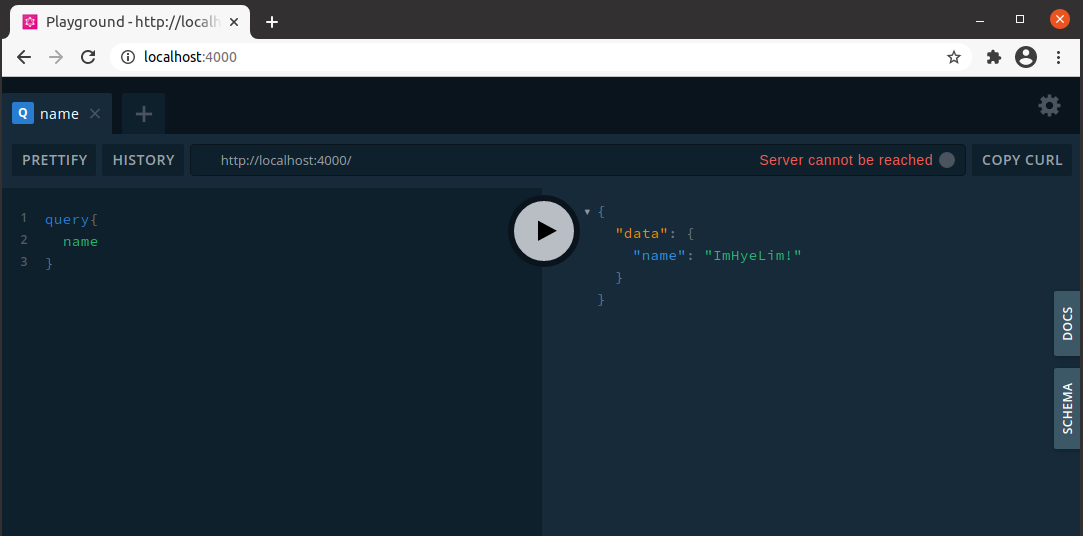 localhost:4000에 가면 playground라는 페이지가 보인다. playground는 postman과 비슷한 툴로, GraphQL 쿼리를 보내면 서버로부터 응답을 받을 수 있다. 위와 같이 쿼리를 날려보면 내가 정의한 데이터 응답을 받을 수 있다.