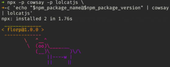 npx를 이용하면 위와 같이 두 패키지의 결과를 합칠 수 있다. 위 명령어는 cowsay, lolcatjslolcatjs를 사용하기 위해 먼저 -p 옵션을 사용한다. 그 후 파이프로 cowsay의 결과에 lolcatjs를 적용한 것이다.