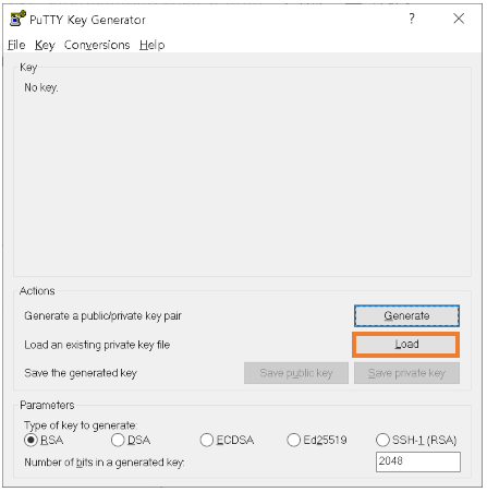PuTTY 설치 후 PuTTygen을 실행하여 Load버튼을 선택한 후, AWS EC2 인스턴스를 생성할 때 저장한 키(.pem)를 선택한다.